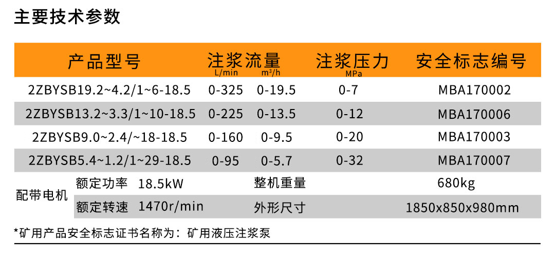 產(chǎn)品型號 | 注漿流量 | 注漿壓力 | 安全標(biāo)志編號 | ||||